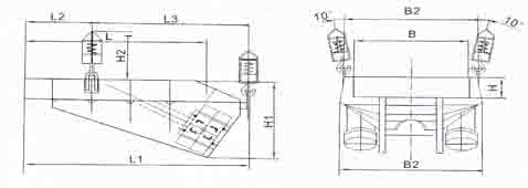 GZG電機振動給料機(電機側置式)電機轉動給料機設計時未考慮倉壓倒影響,為保證給料機的正常運行,必須盡量減少倉壓對給料機的影響。因此在設計溜嘴時,應用溜嘴的后側板承擔料柱的垂直壓力。溜嘴形式及配置尺寸可參考圖及表中數(shù)值。