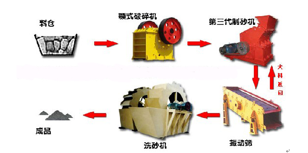 機(jī)制砂石設(shè)備基本流程:先石料由粗碎機(jī)進(jìn)行初步破碎,然后,產(chǎn)成的粗料由膠帶輸送機(jī)輸送至細(xì)碎機(jī)進(jìn)行進(jìn)一步破碎,細(xì)碎后的石料進(jìn)振動篩篩分出兩種石子,滿足制砂機(jī)進(jìn)料粒度的石子進(jìn)制砂機(jī)制砂,另一部分返料進(jìn)細(xì)破。進(jìn)制砂機(jī)的石子一部分制成砂,經(jīng)洗砂機(jī)(可選)清洗后制成成品砂,另一部分進(jìn)制砂機(jī)再次破碎。