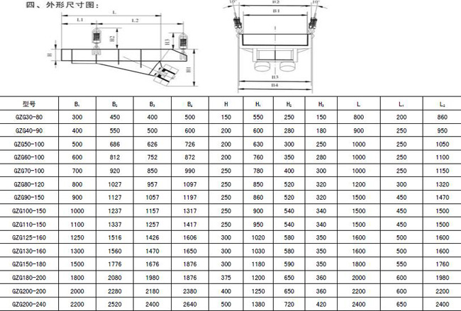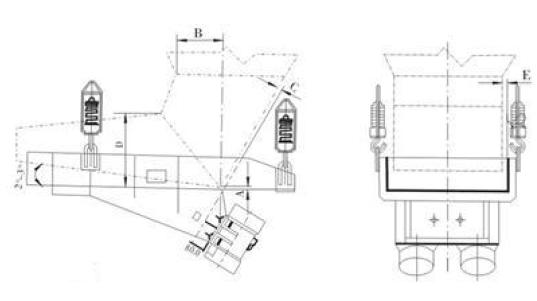 電機(jī)振動(dòng)給料機(jī)設(shè)計(jì)時(shí)未考慮倉(cāng)壓的影響,為保證給料機(jī)的正常運(yùn)行,必須盡量減少倉(cāng)壓對(duì)給料機(jī)的影響。因此在設(shè)計(jì)溜嘴時(shí),應(yīng)用溜嘴的后側(cè)板承擔(dān)料柱的垂直壓力。溜嘴形式及配置尺寸可參考圖及表中數(shù)值。